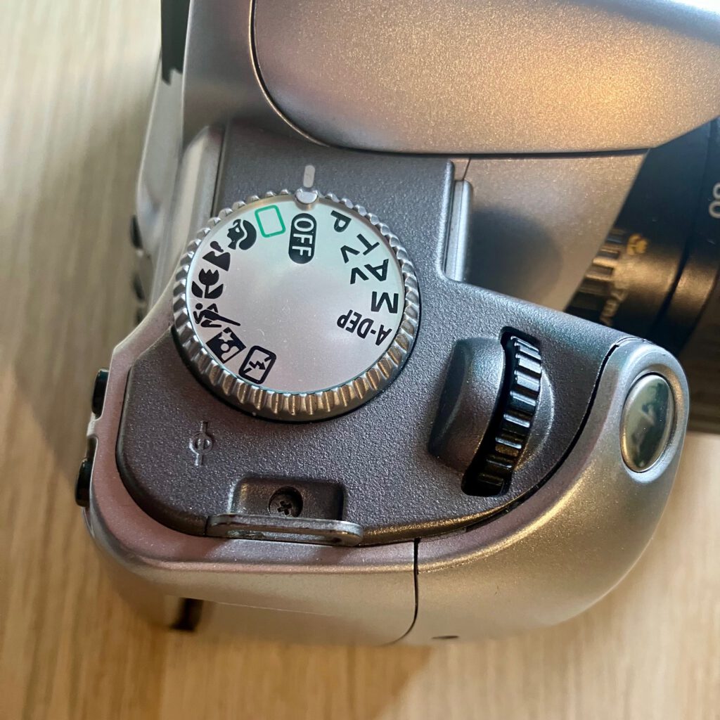 Was die Kamera den Nikons aus der Zeit aber voraus hat, und das nenne ich beinahe einen Geniestreich: Im Grunde lässt sie sich komplett mit einer Hand bedienen. Ganz einfach, weil das Moduswahlrad auf die rechte Seite gewandert ist und damit wunderschön in Daumennähe ruht. Einzig der Selbstauslöser und der Schalter für Serienmodus holen die linke Hand aus der Pause.